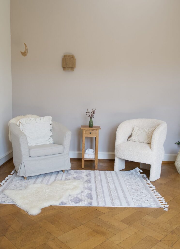 Mein Praxisraum ist ein heller, freundlicher Ort, der Ruhe vermittelt und eine harmonische, entspannte Atmosphäre schafft. Die Sitzecke bietet einen geschützten Rahmen für Gespräche und persönliche Prozesse, der Raum selbst genügend freien Platz für Bewegungs- und Körpertherapie.